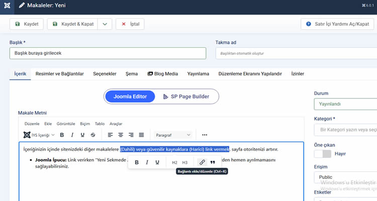 Joomla İpucu: Link verirken "Yeni Sekmede Aç" seçeneğini kullanarak kullanıcıların sitenizden hemen ayrılmamasını sağlayabilirsiniz.