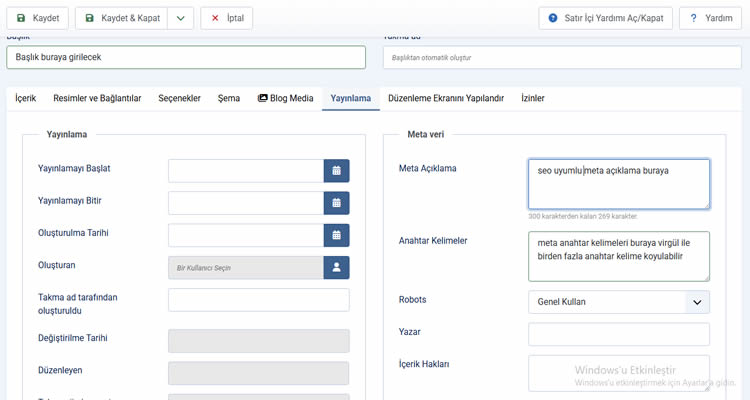 4. Meta Verileri Yönetimi (Yayınlama Sekmesi)