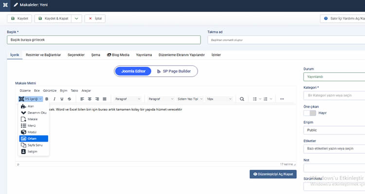 Joomla'da ayrıca içerik'e farklı birden fazla resim eklemek için bir sonraki görselden devam edelim.